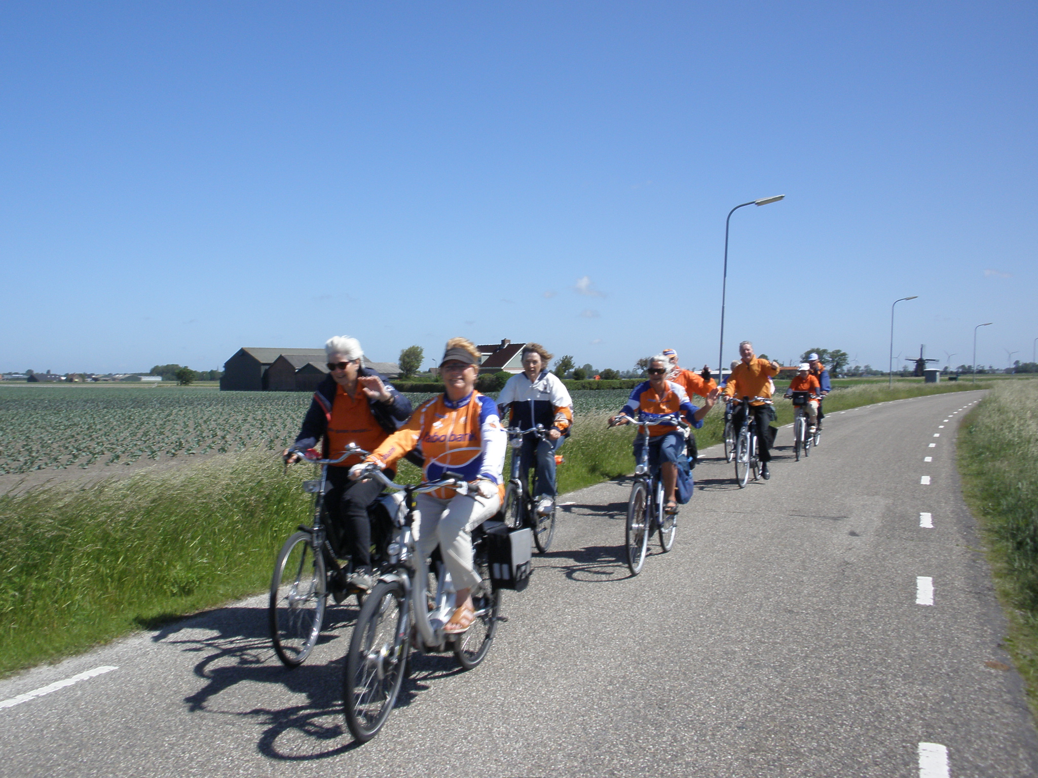 Het was zaterdag 6 juni een mooie zonnige, niet te warme dag en dus prima fietsweer. En al helemaal mooi, omdat de Rabobank Alkmaar e.o. de uitgestippelde tocht beloonde met maximaal € 300,00 als de tocht werd volbracht. Dat waren we vast van plan, dus vertrokken we om half tien met twaalf leden vanaf de Rabo-vestiging aan de Voorburggracht in Noord-Scharwoude, voorzien van duidelijke routekaarten, consumptiebonnen, flesjes water en rolletjes pepermunt in een handig tasje, voor een goede 30 kilometer door de mooie natuur en dorpen.