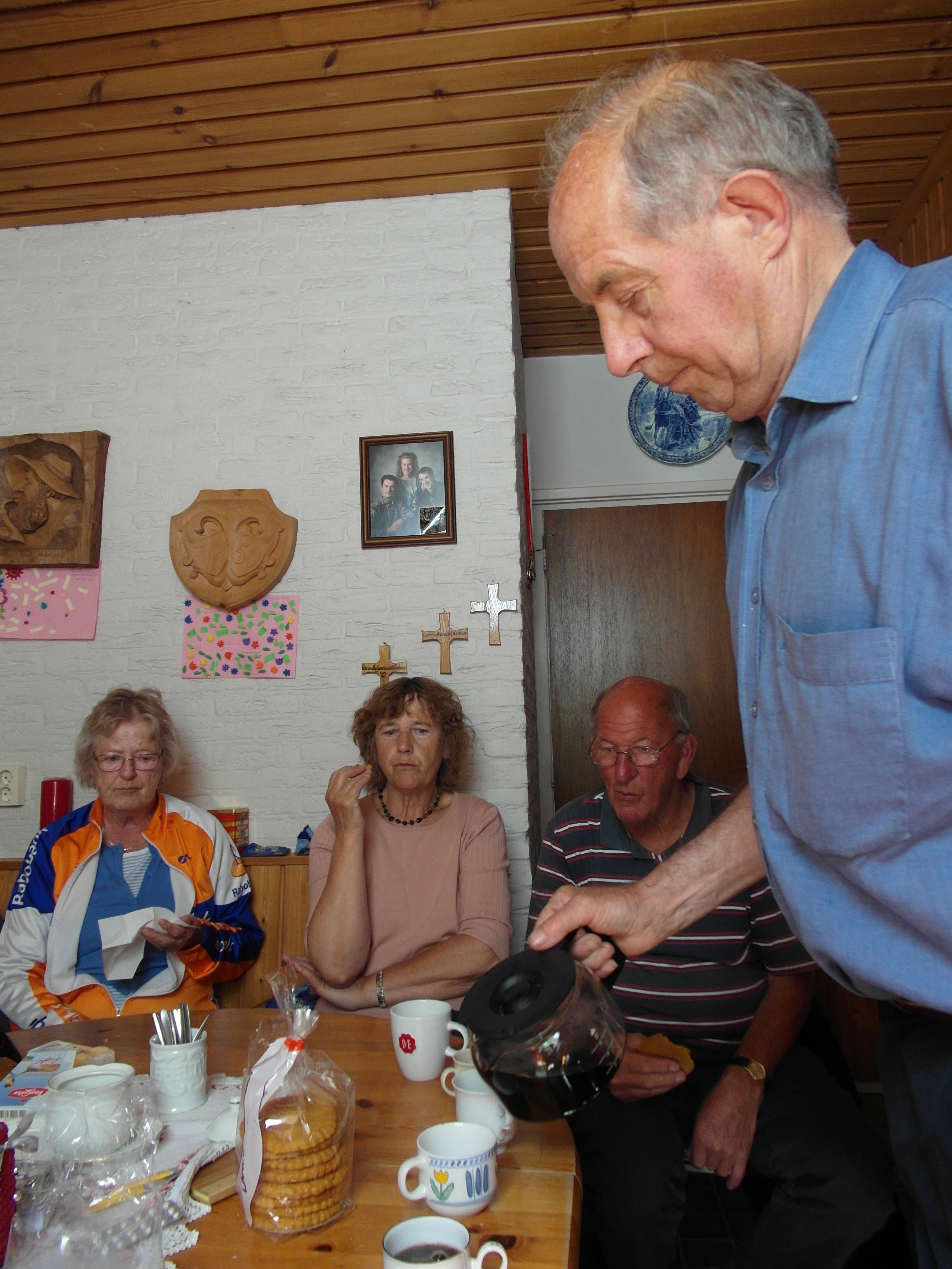 Waarland was als eerste aan de beurt, waarna de route vervolgd werd en we mochten stempelen bij het fraaie “Campingpark de Bongerd”, waar ook een koffiepunt was ingericht. Voor ons was dit nog een beetje te vroeg (we moesten eerst nog wat meer presteren, vonden wij), dus door naar Tuitjenhorn/Kalverdijk. Laat in Kalverdijk nu ons trouwe lid Piet Hof wonen! Deze stond er op, ons in zijn gezellige woning op lekkere koffie/thee met een idem koek te trakteren!